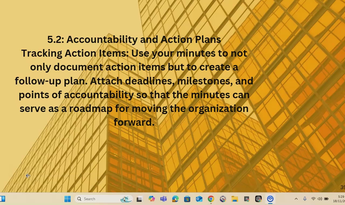 Great minutes turn discussion into action. This lesson shows you how to document responsibilities, set deadlines, and track progress so meeting outcomes lead to real results and accountability.