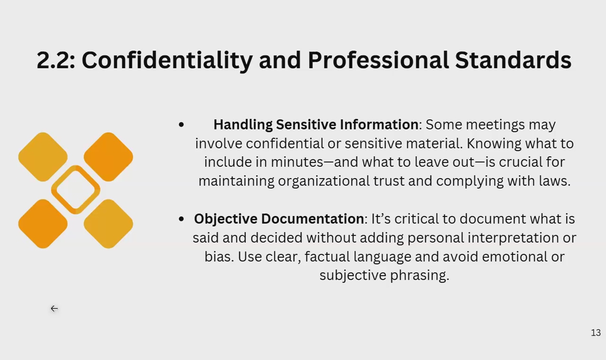 Meeting minutes often contain sensitive information. This lesson explores how to protect confidentiality, maintain neutrality, and uphold professional standards so your records remain trustworthy and respected.