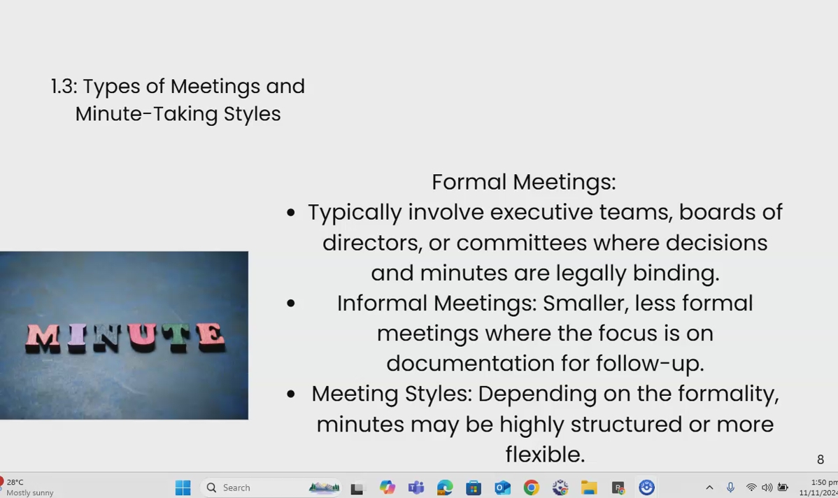 Not all meetings are the same, and neither are the minutes. In this lesson, you’ll explore different types of meetings—formal, informal, —and the best minute-taking style for each, from detailed records to concise action notes.
